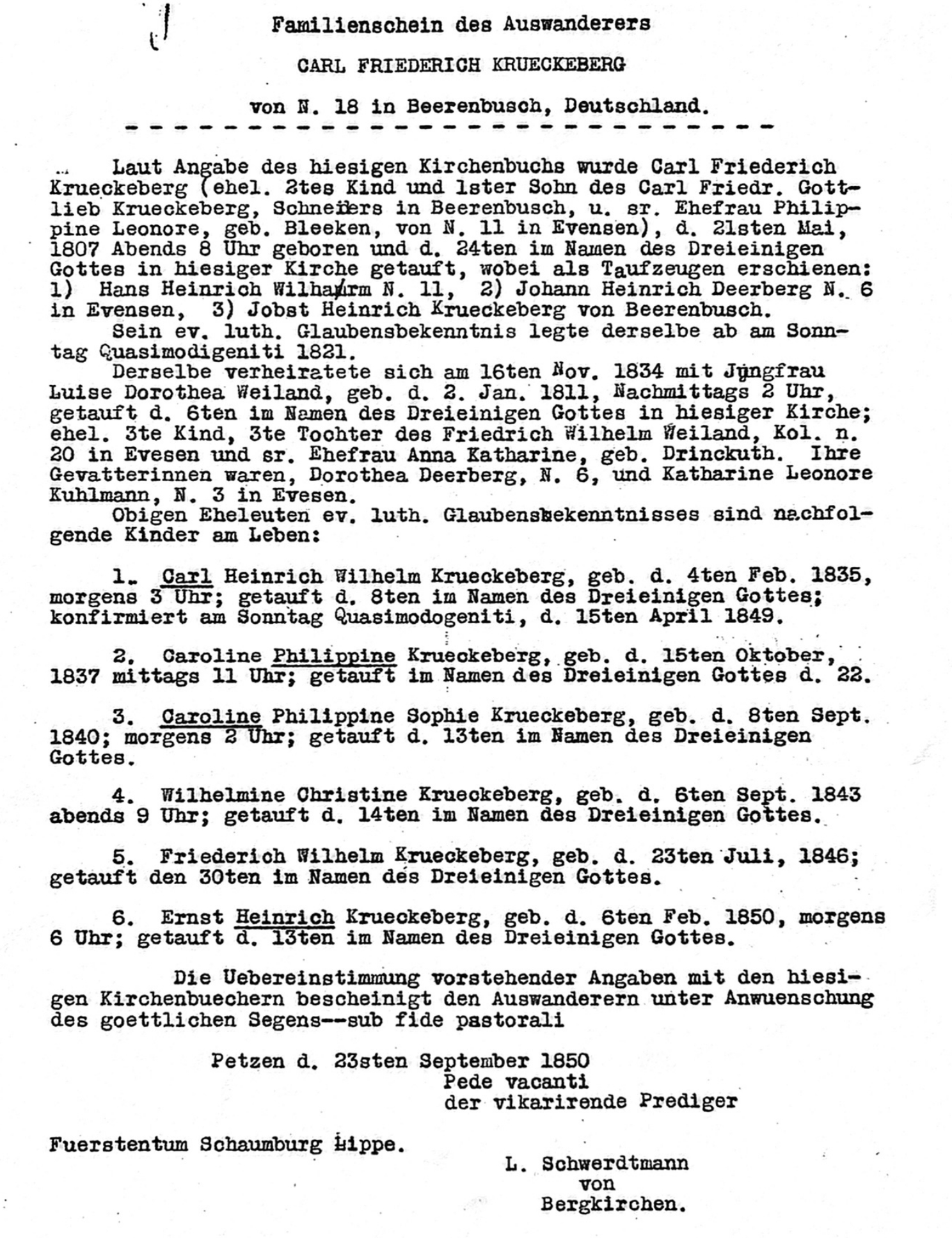 Familienschein des Auswanderers Carl Friederich Krückeberg von N. 18 in Beerenbusch, Deutschland. Laut Angabe des hiesigen Kirchenbuchs wurde Carl Friederich Krückeberg (eheliches 2tes Kind und 1ster Sohn des Carl Friedrich Gottlieb Krueckeberg, Schneiders in Beerenbusch, und seine Ehefrau Philippine Leonore geb. Bleeken, von N. 11 in Evensen), d. 21sten Mai, 1807 Abends 8 Uhr geboren und d. 24ten im Namen des Dreieinigen Gottes in hiesiger Kirche getauft, wobei als Taufzeugen erschienen: 1) Hans Heinrich Wilharm N. 11, 2) Johann Heinrich Deerberg N. 6 in Evensen, 3) Jobst Heinrich Krueckeberg von Beerenbusch. Sein evangelishes lutheranisches Glaubensbekenntnis legte derselbe ab am Sonntag Quasimodigeniti 1821. Derselbe verheiratete sich am 16ten Nov. 1834 mit Jungfrau Luise Dorothea Weiland, geb. d. 2. Jan. 1811, Nachmittags 2 Uhr getauft d. 6ten im Namen des Dreieinigen Gottes in hiesiger Kirche; ehel. 3te Kind, 3te Tochter des Friedrich Wilhelm Weiland, Kol. n. 20 in Evensen und sr. Ehefrau Anna Katharine, geb. Drinckuth. Ihre Gevatterinnen waren, Dorothea Deerberg, N. 6, und Katharine Leonore Kuhlmann, N. 3 in Even. Obigen Eheleuten ev. luth. Glaubensbekenntnisses sind nachfol- gende Kinder am Leben: 1. Carl Heinrich Wilhelm Krueckeberg, geb. d. 4ten Feb. 1835, morgens 3 Uhr; getauft d. 8ten im Namen des Dreieinigen Gottes; konfirmiert am Sonntag Quasimodogeniti, d. 15ten April 1849. 2. Caroline Philippine Krueckeberg, geb. d. 15ten Oktober, 1837 mittags 11 Uhr; getauft im Namen des Dreieinigen Gottes d. 22. 3. Caroline Philippine Sophie Krueckeberg, geb. d. 8ten Sept. 1840; morgens 2 Uhr; getauft d. 13ten im Namen des Dreieinigen Gottes. 4. Wilhelmine Christine Krueckeberg, geb. d. 6ten Sept. 1843 abends 9 Uhr; getauft d. 14ten im Namen des Dreieinigen Gottes. 5. Friederich Wilhelm Krueckeberg, geb. d. 23ten Juli, 1846; getauft den 30ten im Namen des Dreieinigen Gottes. 6. Ernst Heinrich Krueckeberg, geb. d. 6ten Feb. 1850, morgens 6 Uhr; getauft d. 13ten im Namen des Dreieinigen Gottes. Die Übereinstimmung vorstehender Angaben mit den hiesigen Kirchenbuechern bescheinigt den Auswanderern unter Anwuenschung des goettlichen Segens—sub fide pastorali Petzen d. 23sten September 1850 Pede vacanti der vikarirende Prediger Fürstentum Schaumburg Lippe. L. Schwerdtmann von Bergkirchen. |