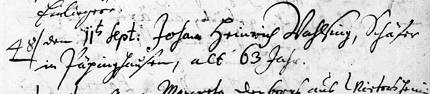 48) On 11 September: Johann Heinrich Vahlsing, sheperd in Päpinghausen [died], age 63 years.
