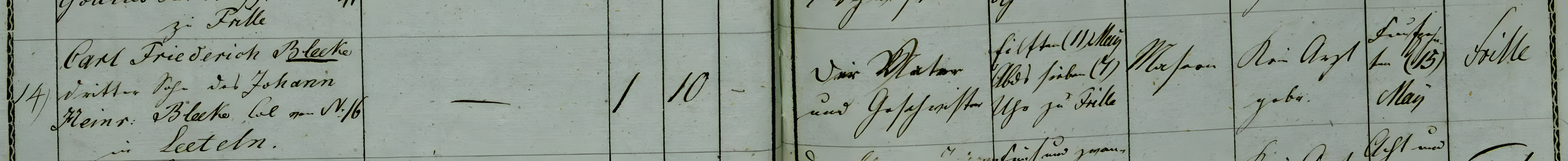 Evangelische Gemeinde Frille, Kreis Minden, "Verstorbene im Jarh 1825", entry #14 for Carl Friederich Bleeke, died 11 May 1825, Kirchenbuchduplikat, B 168 (GHT 1815–1830), Personenstandsarchiv Westfalen-Lippe, Landesarchiv Nordrhein-Westfalen, Abteilung Ostwestfalen-Lippe, Detmold. Digital images: Landesarchiv NRW, https://www.archive.nrw.de (accessed 6 December 2025).