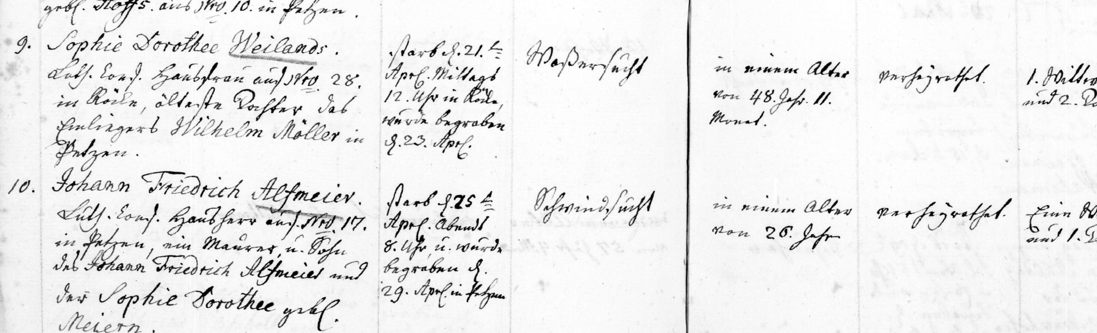 The death and burial of Sophie Dorothee Weiland appears on image 247 of the Archion.de digital images of the Petzen church register Verzeichnis der Getauften, Konfirmierten, Getrauten und Gestorbenen 1785-1827.