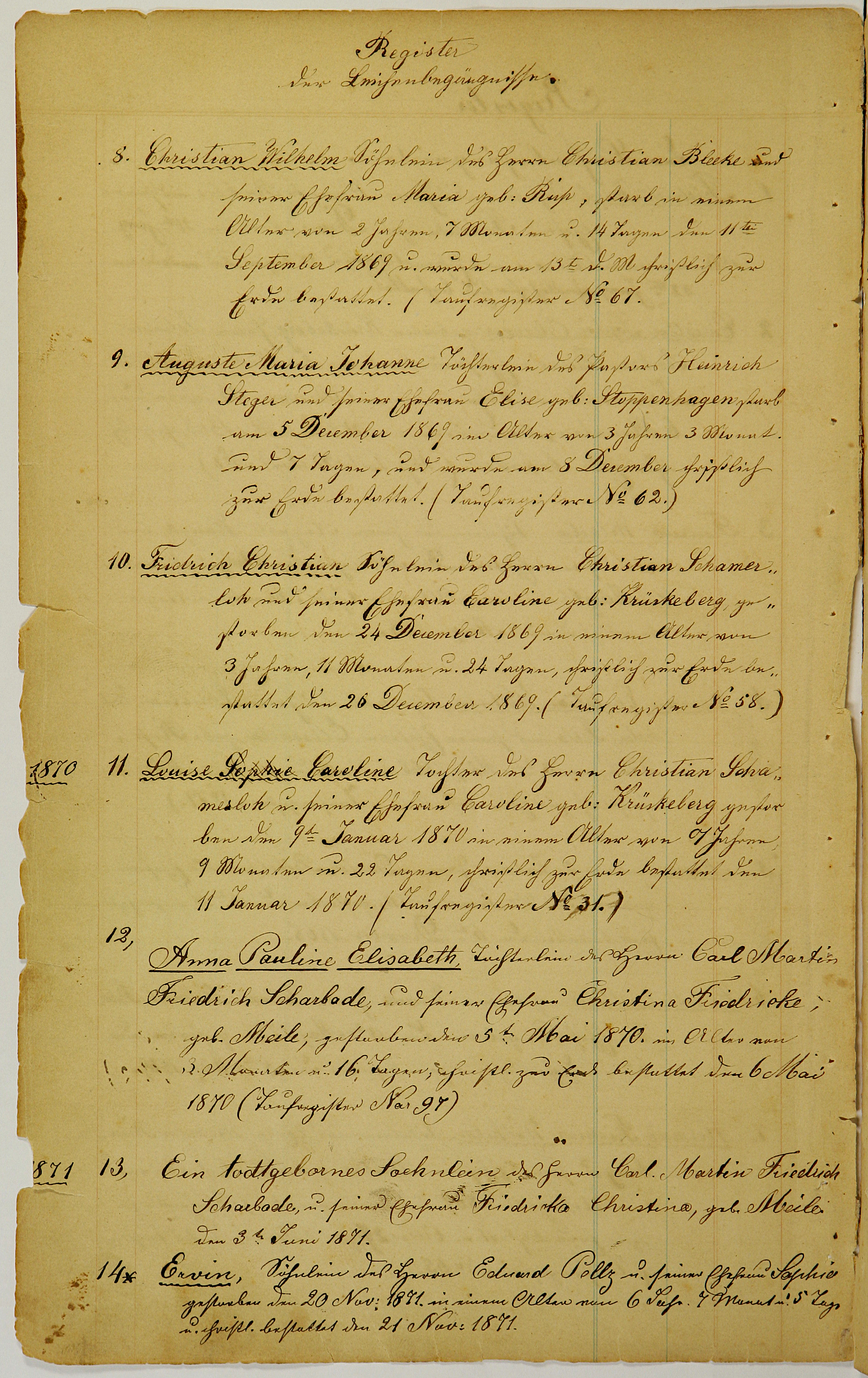 Louise Sophie Caroline, daughter of Mr. Christian Schamerloh and his wife Caroline, née Krückeberg, died on January 9, 1870, at the age of 7 years, 9 months, and 22 days. Buried in a Christian ceremony on January 11, 1870. (Baptismal Register No. 31.)