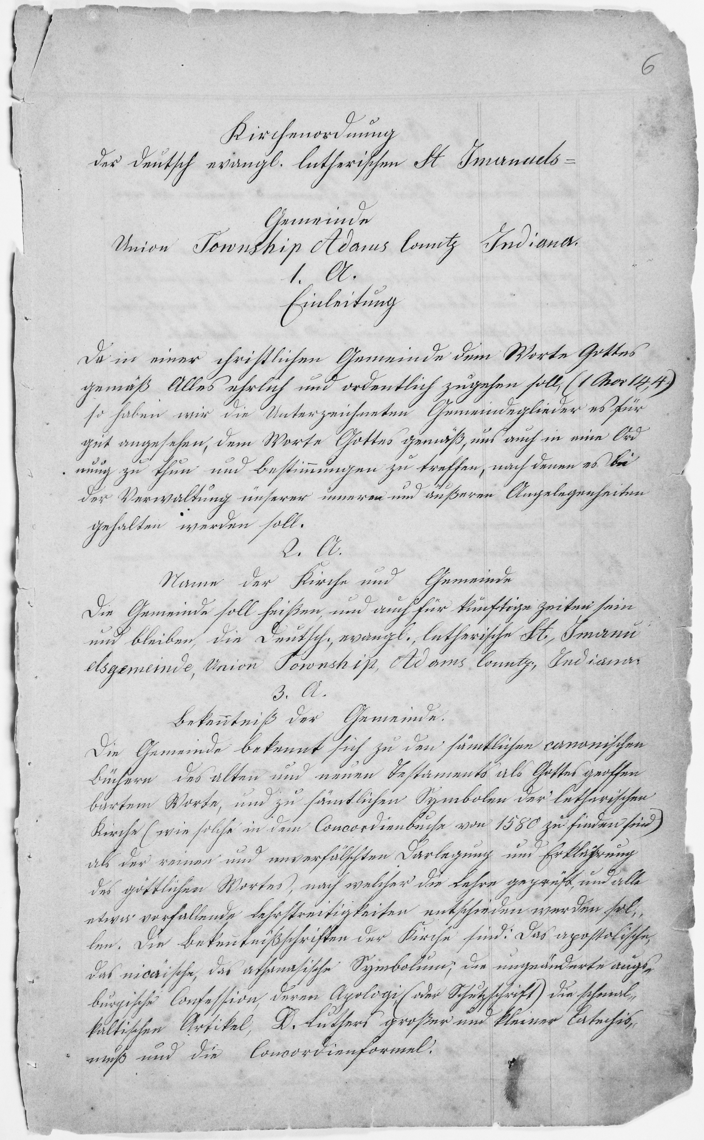 The congregation shall be called, and also for future times be and remain: the German Evangelical Lutheran St. Immanuel’s Congregation, Union Township, Adams County, Indiana.
