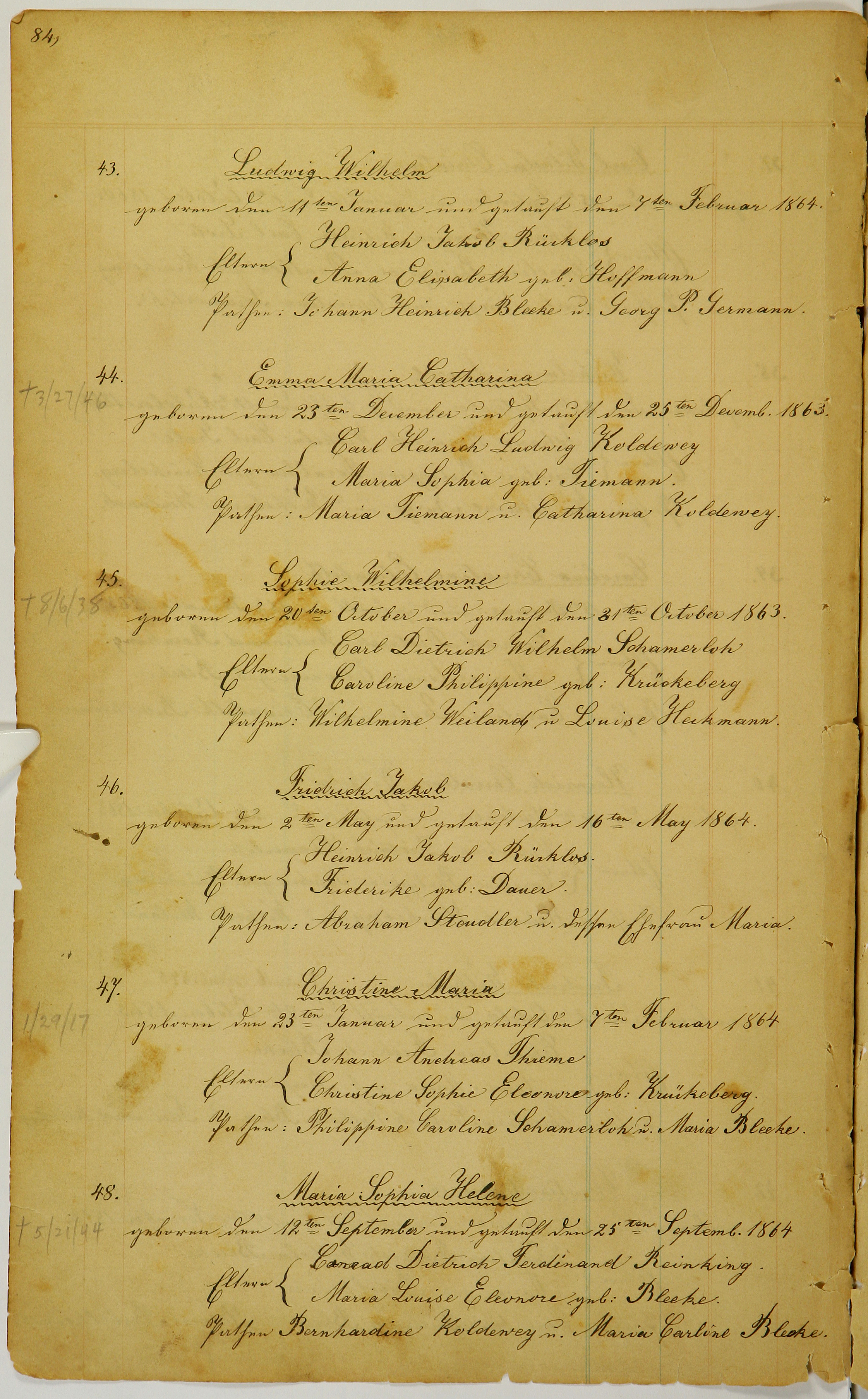Page 84, #43-48 Figure 1. Page 84, image 53 (Click to enlarge) TODO: Add Nachträge Transliteration Translation Ludwig Wilhelm geboren den 11ten Januar und getauft den 7ten Februar 1864. Eltern: Heinrich Jakob Rücklos Anna Elisabeth geb. Hoffmann Pathen: Johann Heinrich Bleeke u. Georg P. Germann. Emma Maria Catharina geboren den 23ten December und getauft den 25ten Decemb. 1863. Eltern: Carl Heinrich Maria Sophia geb. Tiemann. Pathen: Maria Tiemann u. Catharina Koldewey. Sophie Wilhelmine geboren den 20ten October und getauft den 31ten October 1863. Eltern: Carl Dietrich Wilhelm Schamerloh Caroline Philippine geb: Krückeberg Pathen: Wilhelmine Weiland u. Louise Heckmann. Fridrich Jakob geboren den 2ten May und getauft den 16ten May 1864. Eltern: Heinrich Jakob Rücklos. L. Friderike geb. Dauer. Pathen: Abraham Stoudler u. dessen Ehefrau Maria. Christine Maria geboren den 23ten Januar und getauft den 7ten Februar 1864 Eltern: Johann Andreas Thieme Christine Sophie Eleonore geb. Krückeberg. Pathen: Philippine Caroline Schamerloh u. Maria Bleeke. Maria Sophia Helene geboren den 12ten September und getauft den 25ten Septemb. 1864 Eltern: Conrad Dietrich Ferdinand Reinking. Maria Louise Eleonore geb. Bleeke. Pathen Bernhardine Koldewey u. Maria Carline Bleeke Ludwig Wilhelm born on January 11th and baptized on February 7th, 1864. Parents: Heinrich Jakob Rücklos Anna Elisabeth née Hoffmann Godparents: Johann Heinrich Bleeke and Georg P. Germann. Emma Maria Catharina born on December 23rd and baptized on December 25th, 1863. Parents: Carl Heinrich Maria Sophia née Tiemann. Godparents: Maria Tiemann and Catharina Koldewey. Sophie Wilhelmine born on October 20th and baptized on October 31st, 1863. Parents: Carl Dietrich Wilhelm Schamerloh Caroline Philippine née Krückeberg Godparents: Wilhelmine Weiland and Louise Heckmann. Fridrich Jakob born on May 2nd and baptized on May 16th, 1864. Parents: Heinrich Jakob Rücklos. L. Friderike née Dauer. Godparents: Abraham Stoudler and his wife Maria. Christine Maria born on January 23rd and baptized on February 7th, 1864 Parents: Johann Andreas Thieme Christine Sophie Eleonore née Krückeberg. Godparents: Philippine Caroline Schamerloh and Maria Bleeke. Maria Sophia Helene born on September 12th and baptized on September 25th, 1864 Parents: Conrad Dietrich Ferdinand Reinking. Maria Louise Eleonore née Bleeke. Godparents: Bernhardine Koldewey and Maria Carline Bleeke Page 83, #37-42 Page 85, #49-54