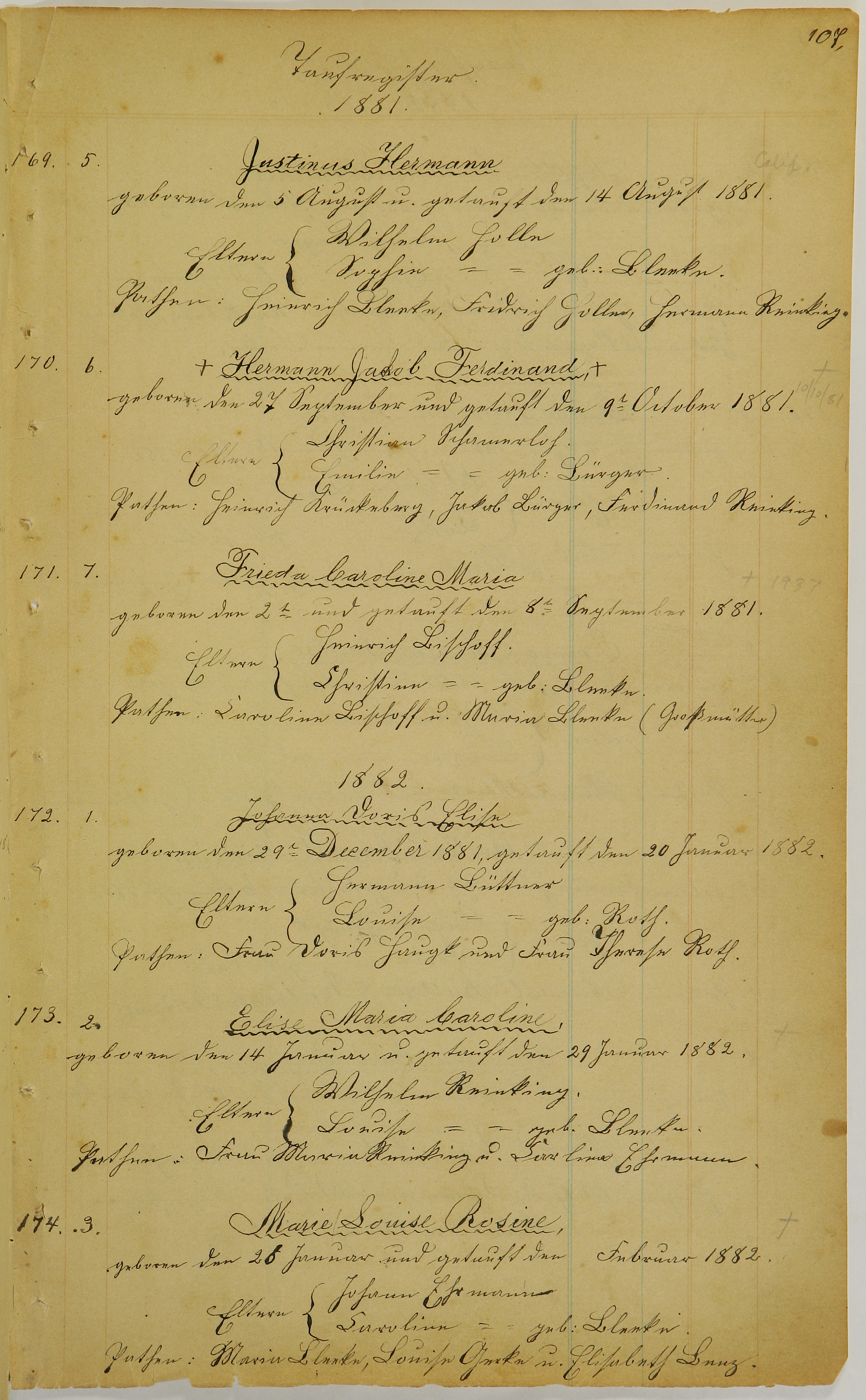 Godparents: Heinrich Krückeberg, Jakob Bürger, Ferdinand Reinking.