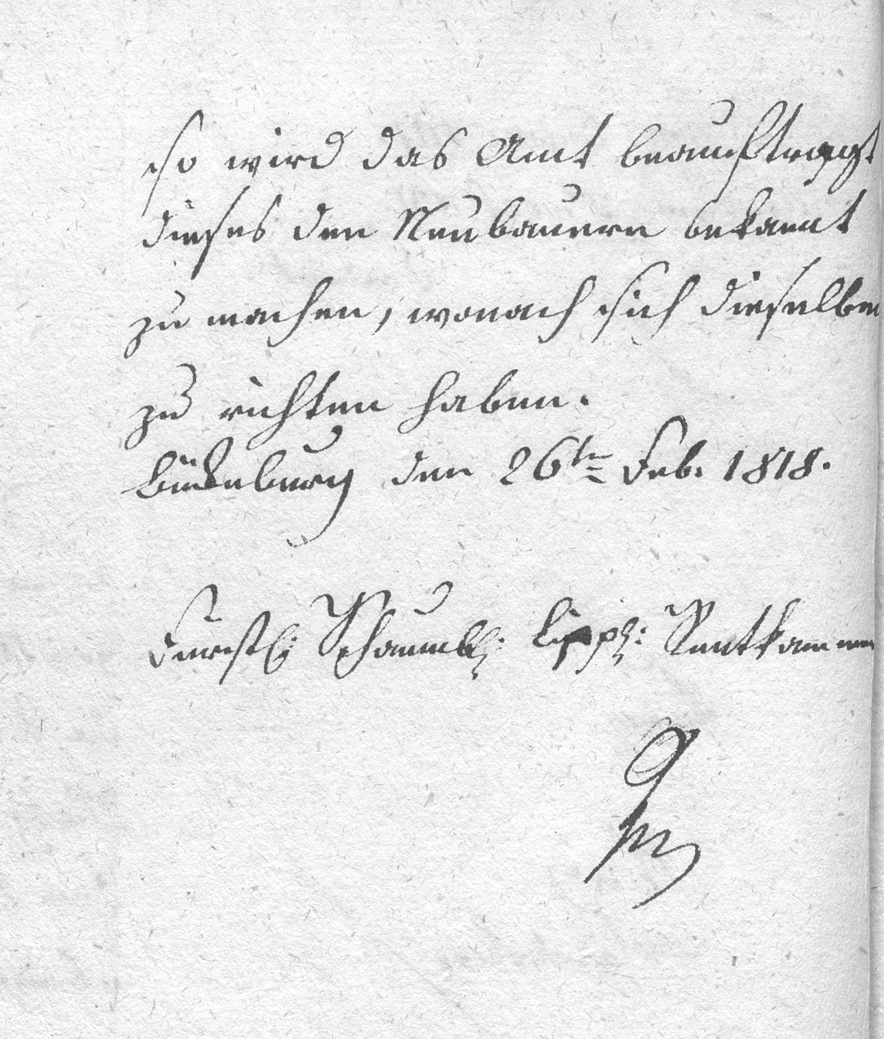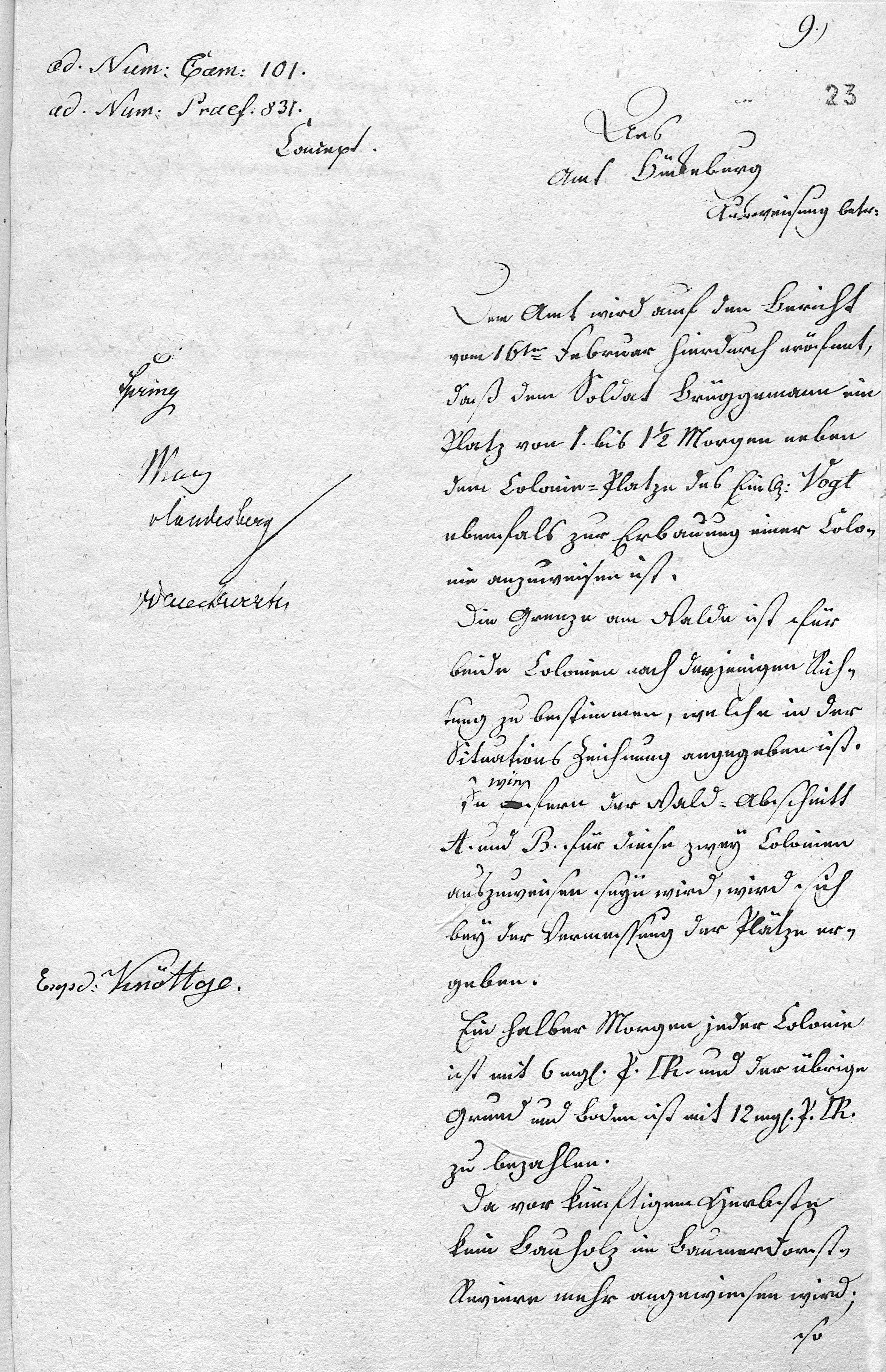 ad Num: Cam: 101. 9., ad Num. Praef. 831. Draft. [signatures of: Spring Wag vlandesberg Waceckwerten] Dispatched: Knöttge. To the Office of Bückeburg Re: Land assignment The Office is hereby informed, in response to the report of 16 February, that to the soldier Brüggemann a plot of 1 to 1½ Morgen, adjoining the colony plot of the lodger Vogt, is likewise to be assigned for the establishment of a colony. The boundary at the forest is to be determined for both colonies according to the direction indicated in the situational drawing. To what extent the forest section A and B is to be assigned for these two colonies will be determined during the surveying of the plots. Half a Morgen of each colony is to be paid for at 6 mgl. P. per square rod, and the remaining land is to be paid for at 12 mgl. P. per square rod. Since no construction timber will be allocated in the Baumerdornst district before the coming autumn, the Office is instructed to make this known to the new farmers, by which they are to govern themselves. Bückeburg, 26 February 1818. Princely Schaumburg-Lippe Rentkammer.