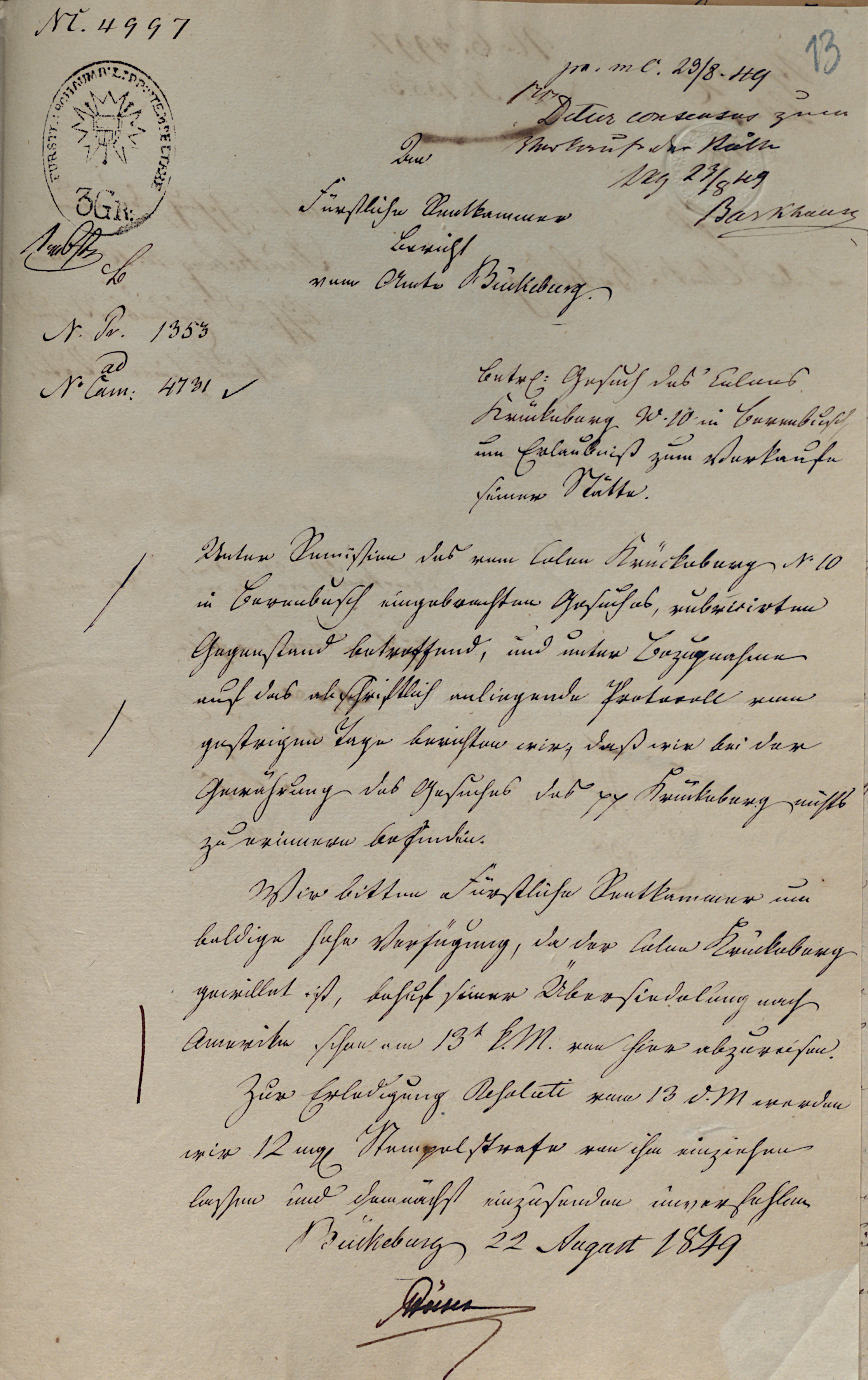No. 4997 Stamp: 3 Groschen. Presented at the Chancellery, August 23, 1849. NC 7 Let consent be given to the sale of the holding. Stamp duty recorded 23 August 1849. Barkhausen To the Princely Rent Chamber from the Office of Bückeburg. Protocol No. 1353. to Case No. 4731 Re: Petition of the Colon Krückeberg No. 10 in Berenbusch for permission to sell his holding. With the forwarding of the petition submitted by Colon Krückeberg No. 10 in Berenbusch, concerning the captioned matter, and with reference to the protocol in copy attached from yesterday, we report that we have nothing to object to the granting of said petition of Krückeberg. We request that the Princely Rent Chamber issue its decision without delay, as Colon Krückeberg is intending, for the purpose of his relocation to America, to depart from here already on the 13th of the coming month. In execution of the resolution of the 13th of this month, we will collect from him the 12 Mariengroschen stamp penalty and will submit it without fail. Bückeburg, 22 August 1849 Höner