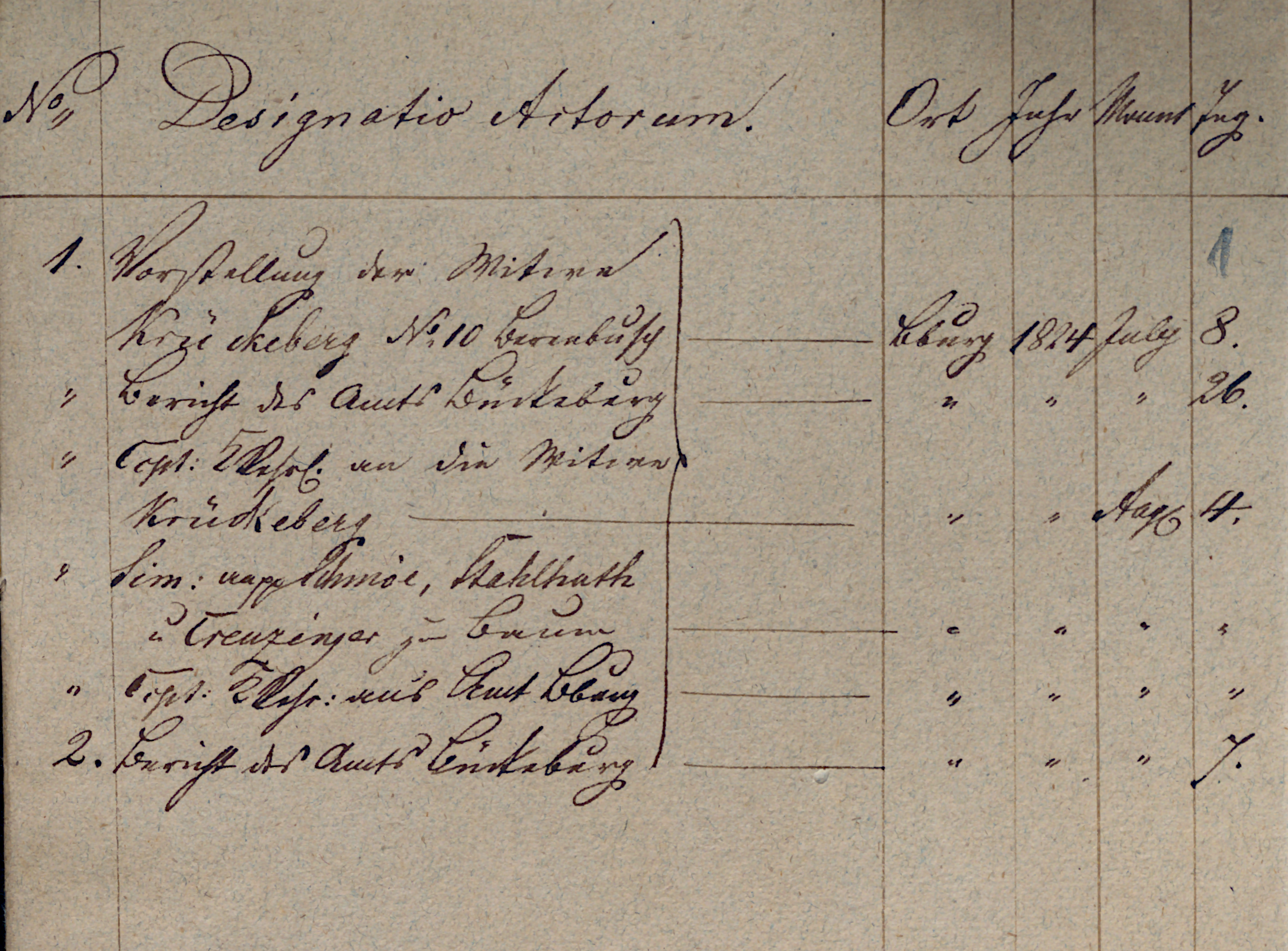 The Designatio Actorum shown below is the table of contents for the case file. All the documents listed in it are from 1822 and concern the petition of the needy widow Krückeberg who petitions the Rentcammer for relief from the obligations of manual labor required of her as a property owner.