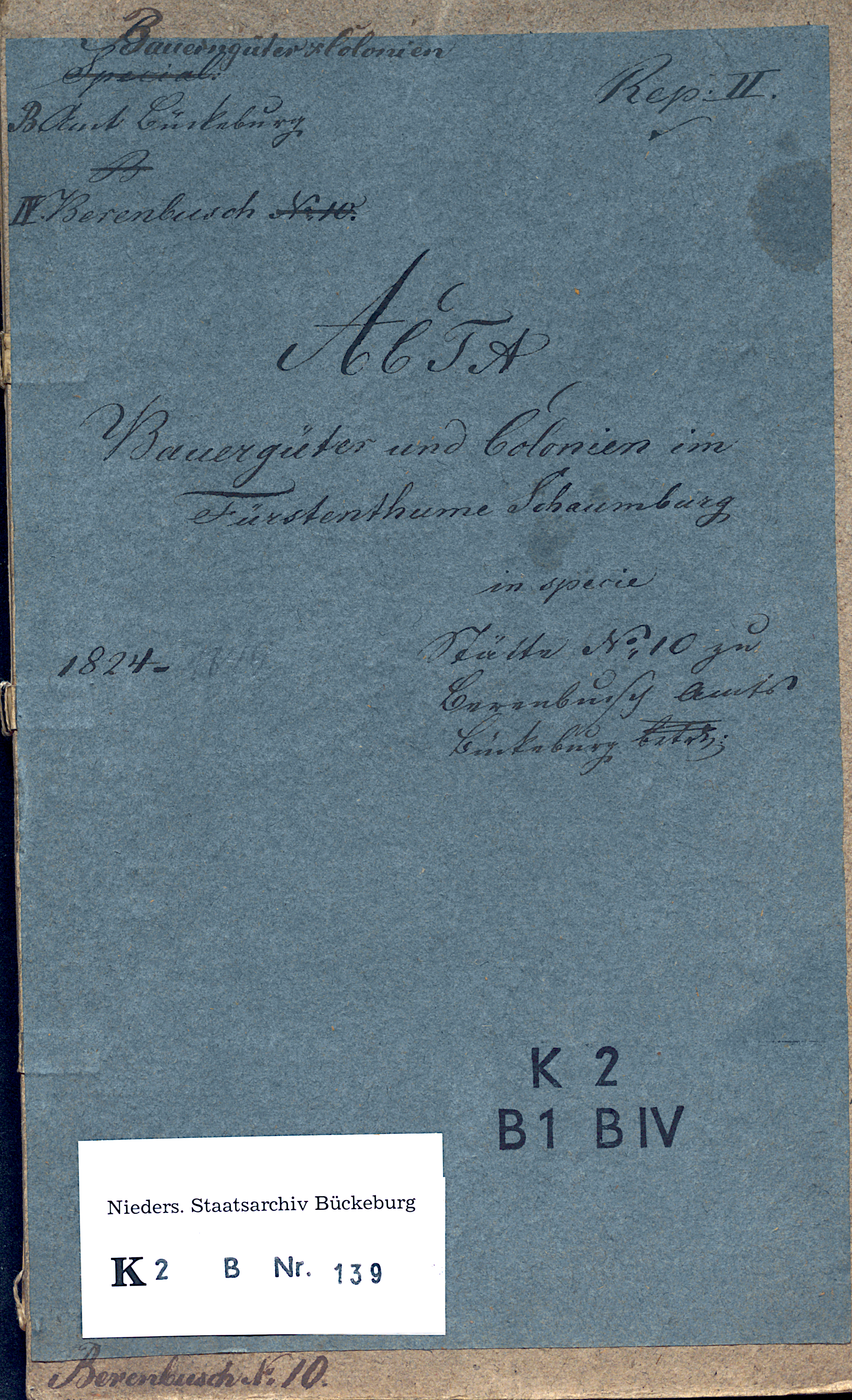 Bauerngüter und Colonien Special Rep:II B. Amt Bückeburg II Berenbusch No. 10 ACTA Bauergüter und Colonien im Fürstenthume Schaumburg in specie 1824- Stätte No. 10 zu Berenbusch Amts Bückeburg Berenbusch No. 10