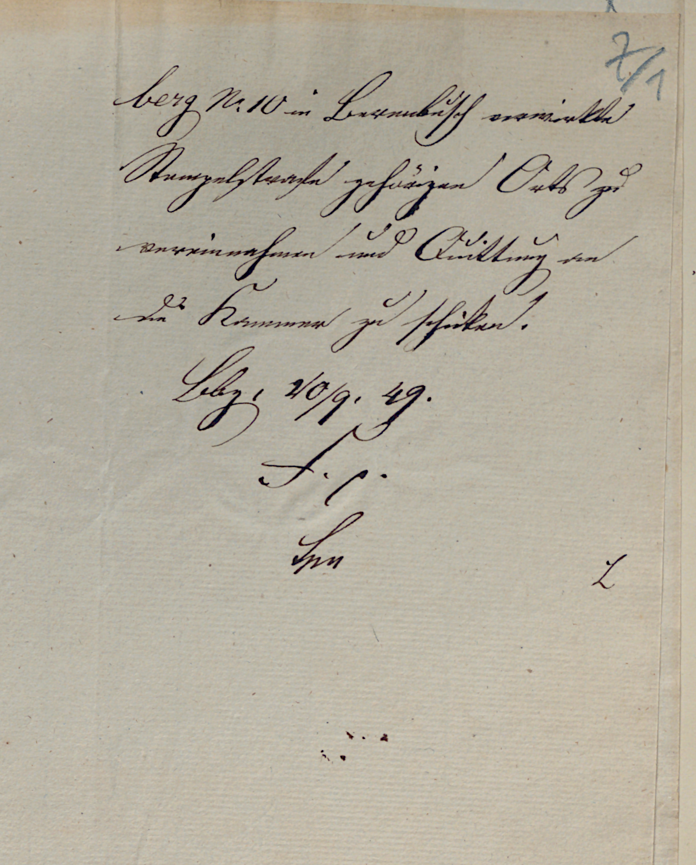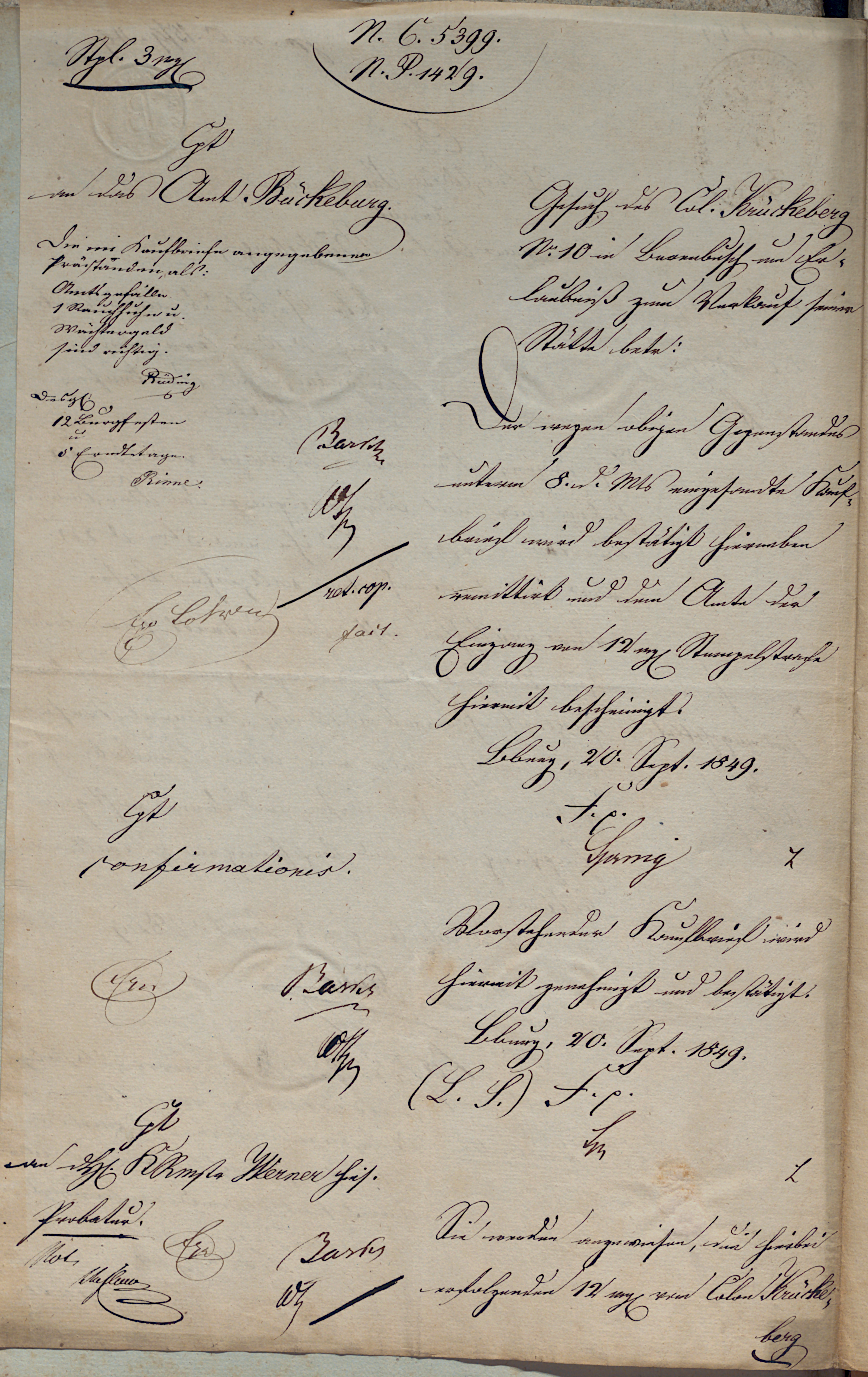 N. C. 5399. N. P. 1429. Stpl. 3 mg.[Mariengroschen: currency] Cpt an das Amt Bückeburg. Die im Kaufbriefe angegebenen Präständen, als: Amtsgefälle 1 Rauchhuhn u. Wächtergeld sind richtig. Rieding Gesuch des Col. Krückeberg No. 10 in Berenbusch um Erlaubniß zum Verkauf seiner Stätte. Betr.: Der wegen obigen Gegenstandes unterm 8. d. Mts. eingesandte Kaufbrief wird bestätigt, hierneben remittirt und dem Amte der Eingang von 12 mg. Stempelstrafe hiermit bescheinigt. Bburg, 20. Sept. 1849. F.p. Spreng [Desselben Gleichen:] Desgl.: 12 Burgfesten u. 5 Erndtetage. Rinne Barth Why /ret. cop. fait. Exp. Lohren Cpt confirmationis. [clerk initials:]Gri Barth Why Vorstehender Kaufbrief wird hiermit genehmigt und bestätigt. Bburg, 20. Sept. 1849. (L.S.) F.p. Lm L Cpt an H. Rmst. Werner hies[elbst]. Probatur. [clerk initials:] Barth Wh Gri Not Stefleur Sie werden angewiesen, die hierbei nachgezeigten 12 ggr. vom Colon Krückeberg berg No. 10 in Berenbusch verwirkte Stempelstrafe gehörigen Orts zu vereinnahmen und Quittung an die Kammer zu schicken. Bbg. 20/9. 49. F. p. Lm L