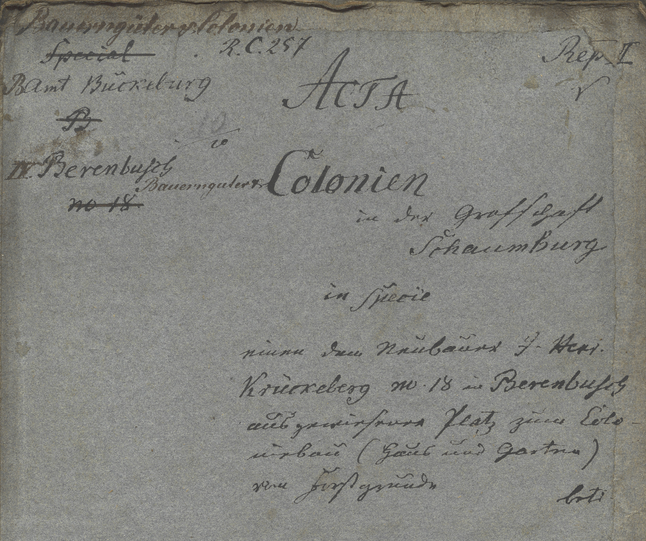 Administrative cover for a Rentkammer case concerning the assignment of a house-and-garden building plot on princely land in Berenbusch to Neubauer J. Heinrich Krückeberg, No. 18, under the agrarian holding colonization program of the County of Schaumburg, handled by the Bückeburg district office.