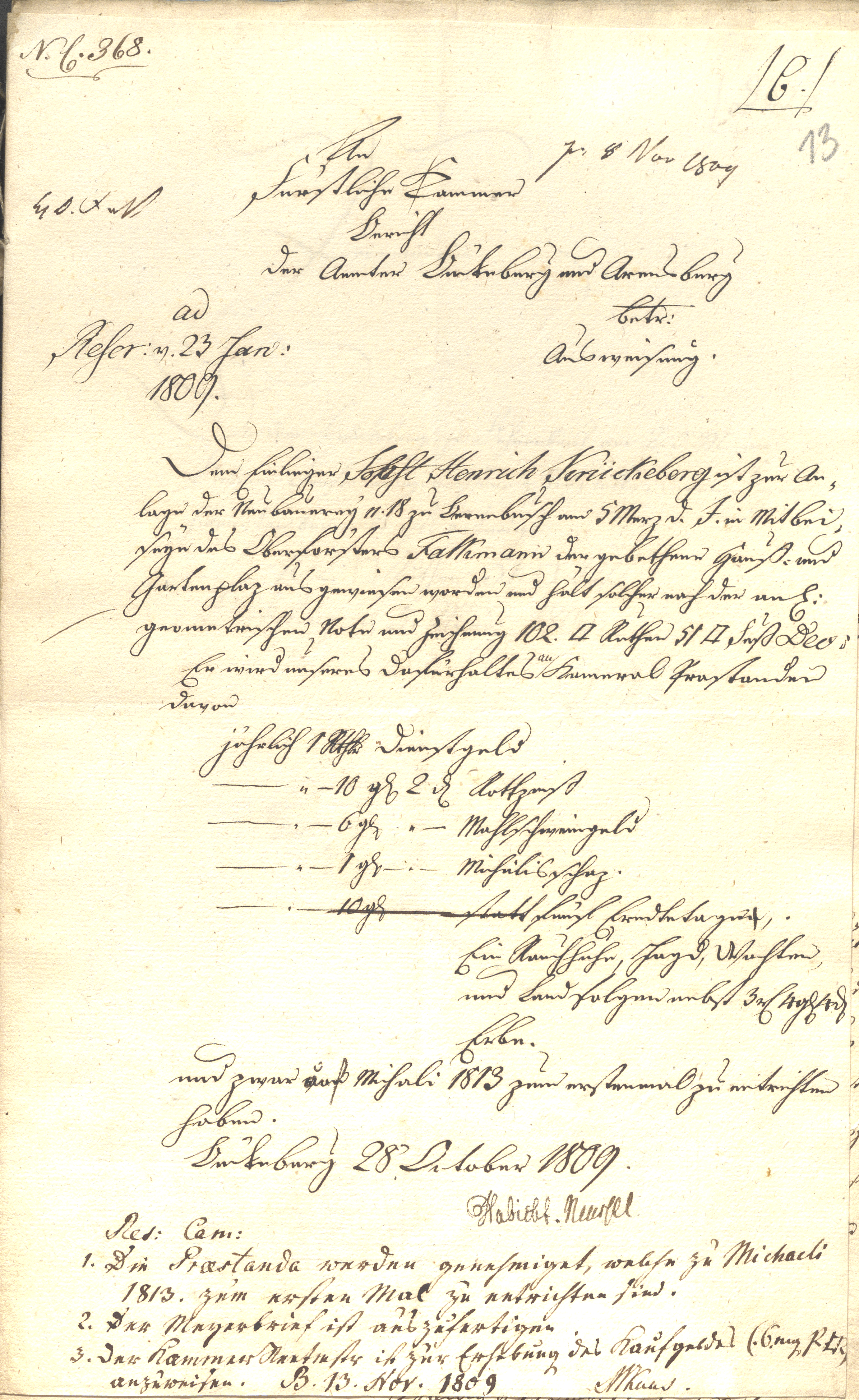 N. C. 368. pr. 8 Nov 1809 [Four-letter marginal filing and routing marks without semantic relevance to the case content] An Fürstliche Kammer Bericht der Aemter Bückeburg und Arensburg betr: Ausweisung. ad Rescr: v. 23 Jan: 1809. Dem Einlieger Jobst Henrich Krückeberg ist zur Anlage der Neubauereÿ n.18 zu Berenbusch am 5 März d. J. in Mitbeiseÿn des Oberforsters Falkmann der gebethene Haus- und Gartenplaz ausgewiesen worden, und hält solcher nach der an: geometrischen Note und Zeichnung 102. [Quadrat] Ruthen 51 [Quadrat] Fuß Dec. Er wird unseres Dafürhaltens in kammeral Prästanden davon jährlich 1 Rthlr Dienstgeld [jährlich] 10 g. 2 d. Kottzmis [jährlich] 6 gl. Mahlschweingeld [jährlich] 1 gl. Michilisschaz [jährlich] fünf Eredtetage[n], ein Rauchhuhn, Jagd-, Wacht- und Landfolgen nebst 3 rt. 4 g. 4 d. Erbe, und zwar auf Michali 1813 zum erstenmal zu entrichten haben. Bückeburg 28 October 1809. Habicht-Neuesl Res: Cam: 1. Die Prästanden werden genehmiget, welche zu Michali 1813 zum ersten Mal zu entrichten sind. 2. Der Meyerbrief ist auszufertigen 3. Der Kammerrenttmeistr ist zur Erhebung des Kaufgeldes (6. Mg. p. M.) B. 13 Nov. 1809 MKaas