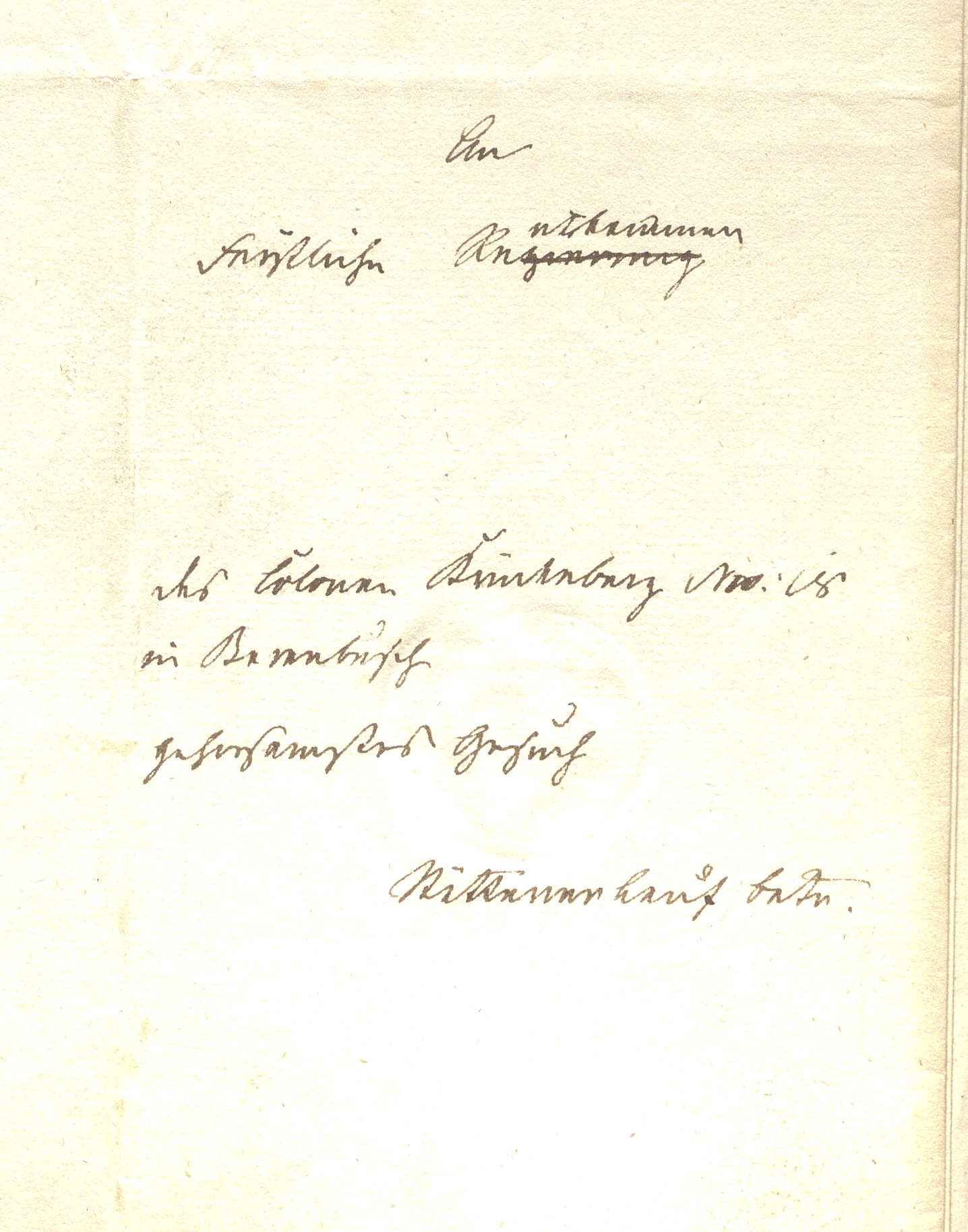 Petition (to sell) Cover Sheet Image Transliteration and Translation Transliteration An Fürstliche Rentkammer des Colonen Krückeberg No 18 in Berenbusch gehorsamstes Gesuch Stättener Lauf betr. Translation Most humble petition of Colon Krückeberg No. 18 in Berenbusch concerning the transfer of his holding Other Documents 11 Sept. 1850: Carl Friedrich Krückeberg Supplication to Rentkammer Requesting Sale of his Holding no. 18 Berenbusch