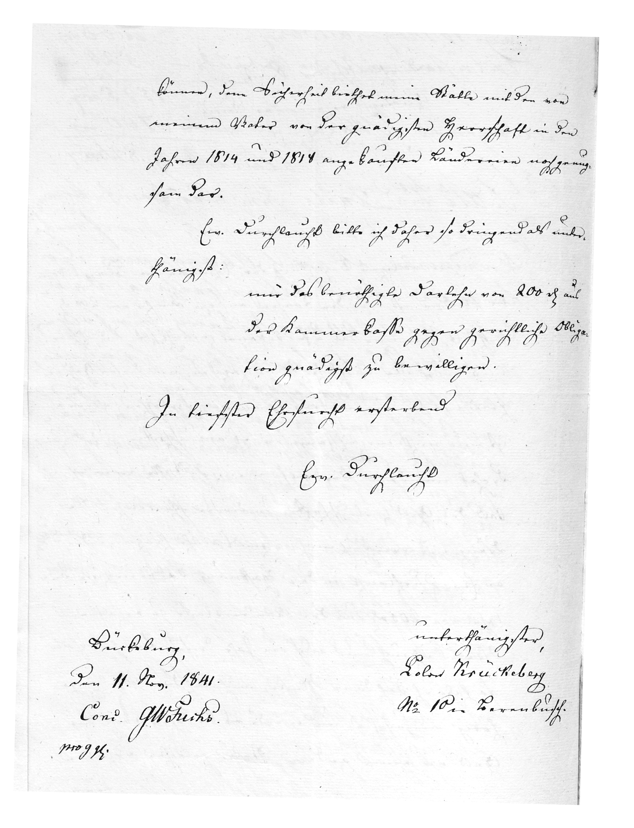 On 11 November 1841, Colon Krückeberg of Berenbusch submitted a petition to the Princely Rentcammer requesting a loan of 200 Reichsthaler from the chamber treasury.
